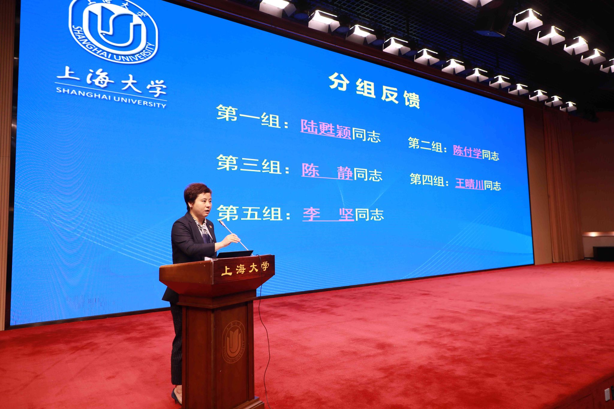 文学院党委书记陆甦颖、生命科学学院党委书记陈付学、上海美术学院党委书记陈静、新闻传播学院党委书记王晴川、后勤保障部党委书记李坚分别代表五个小组作了交流发言,集中反馈了分组研讨成果,并交流介绍了本单位的主题教育特色工作。
