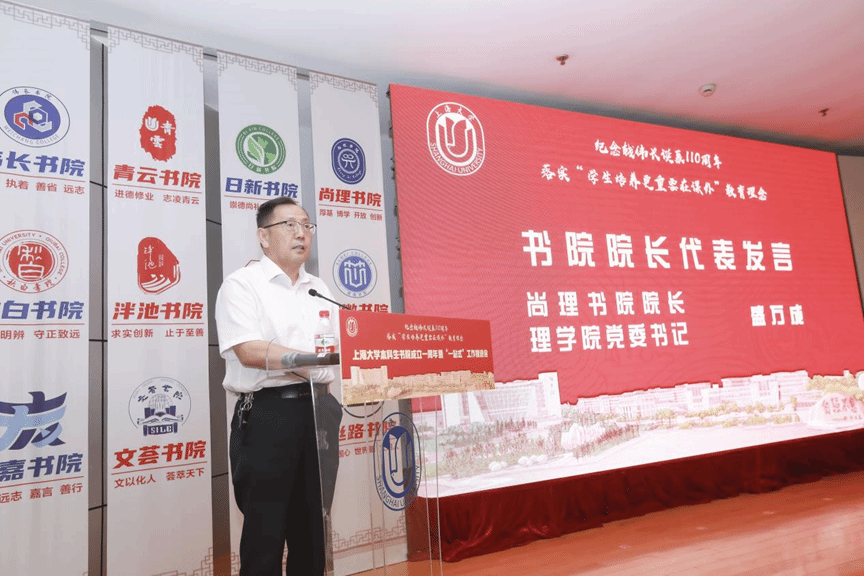 尚理书院院长、理学院党委书记盛万成作为书院院长代表发言,介绍了书院成立一年来的工作情况和未来的发展规划。他表达了对书院建设的信心和决心,并表示将继续为书院建设贡献智慧和力量。