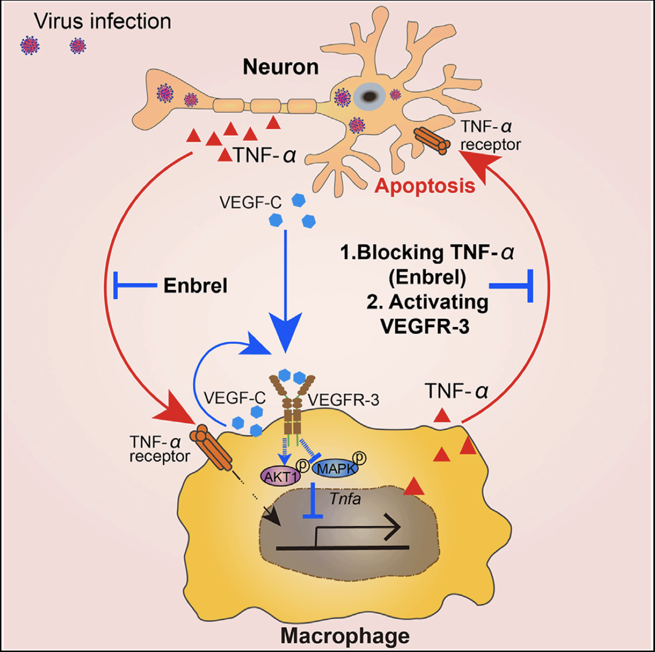 在本研究中,研究人员构建不同嗜神经病毒(JEV、ZIKV和HSV-1)感染的小鼠模型,发现在病毒感染的脑组织中VEGFR-3和配体VEGF-C的含量显著上调。利用巨噬细胞和神经元共培养体系或使用病毒感染的神经元的细胞上清处理巨噬细胞等策略,发现病毒感染的脑组织中升高的VEGF-C能结合并激活巨噬细胞中VEGFR-3信号通路,通过调控PI3K-AKT和MAPK的活化以抑制TNF-α分泌,减少神经元凋亡。为阻断过度的TNF-α加重病毒性脑炎的作用,研究人员使用临床药物依那西普(即重组肿瘤坏死因子受体)处理JEV感染的小鼠以阻断TNF-α与TNF受体的结合。发现通过依那西普阻断TNF-α可减少脑部炎症程度,降低神经元的凋亡以保护宿主。