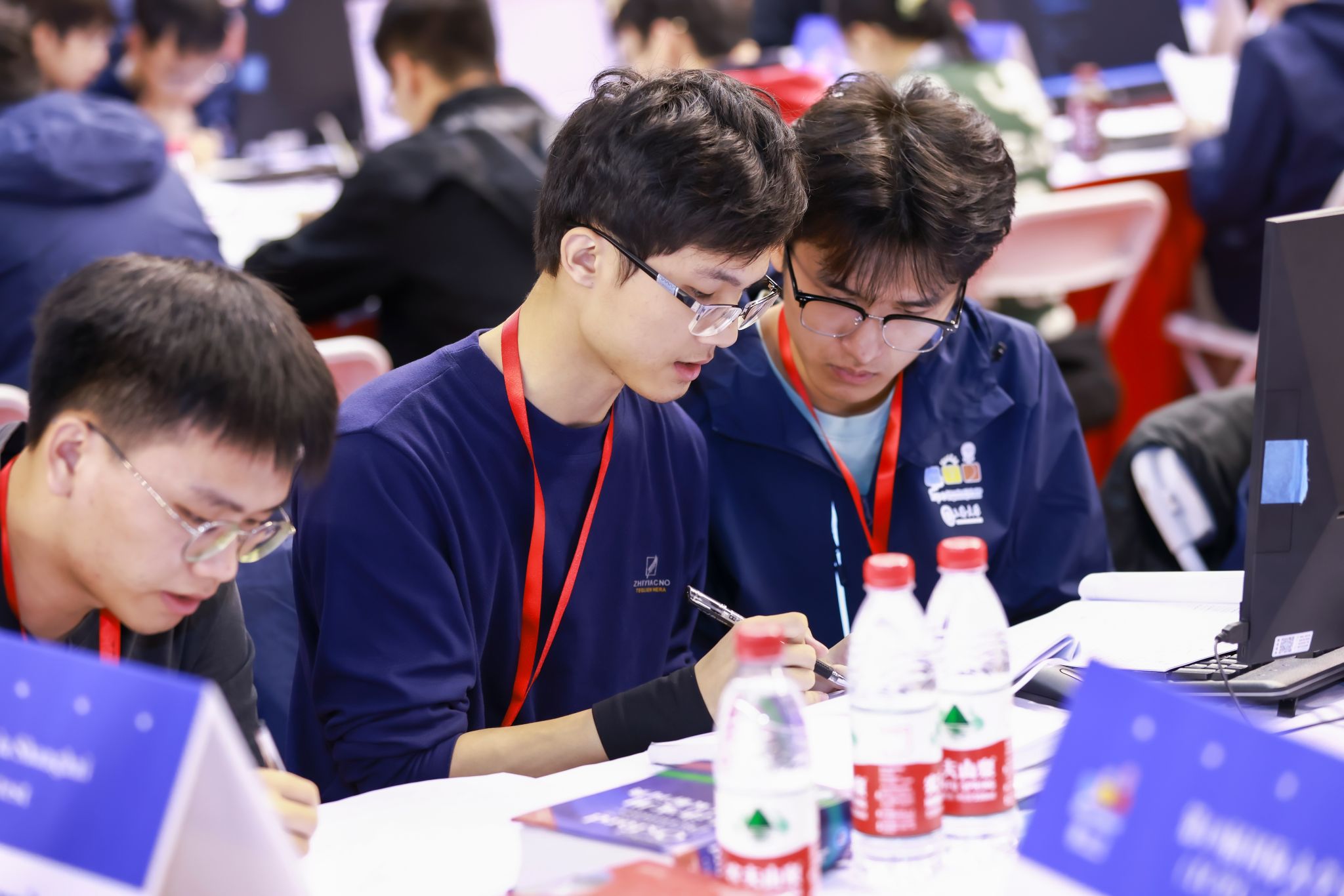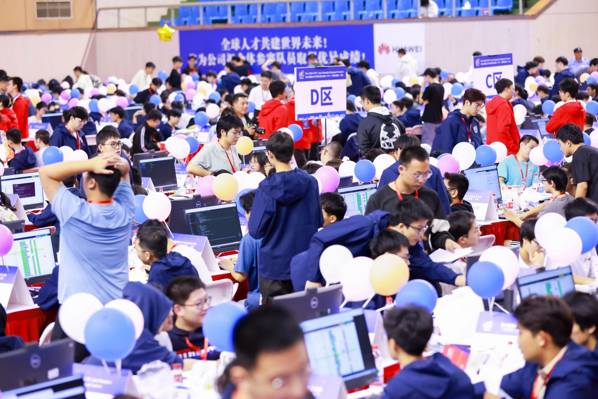 正式比赛于11月17日9:00准时开始,宽敞明亮的体育馆内,数百台电脑整齐排列,每位参赛选手都全神贯注,手指在键盘上跳跃飞舞,将脑海中的算法思路迅速转化为一行行代码,争分夺秒地解决着一个个复杂的问题。比赛开始6分11秒后,来自洛谷科技的参赛队率先解出I题,收获了一支“First Problem Solved”气球。