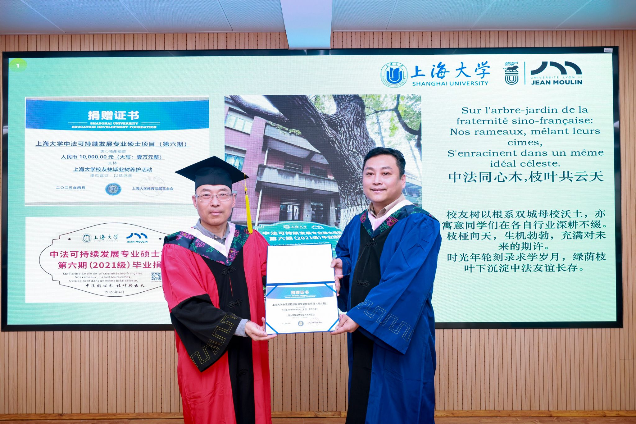 六期毕业生李宏宝和罗斌,分别代表项目综合方向和文博文创方向的毕业生发言。李宏宝同学回顾了当年选择项目时“做难而正确的事”的初心,并分享利用所学知识理论在项目实施中引入节能设备、增加骑行友好设施的真实案例,展现可持续发展项目的魅力。罗斌同学回顾了“第一课堂”知识的获取与“第二课堂”友情的收获,分享了自己从一名普通的建筑设计师,到参与可持续建筑、乡村更新与文化遗产保护项目的心路历程。两位同学代表所有毕业生向中法两所学校、授课教师与工作人员团队表达最真挚感谢!