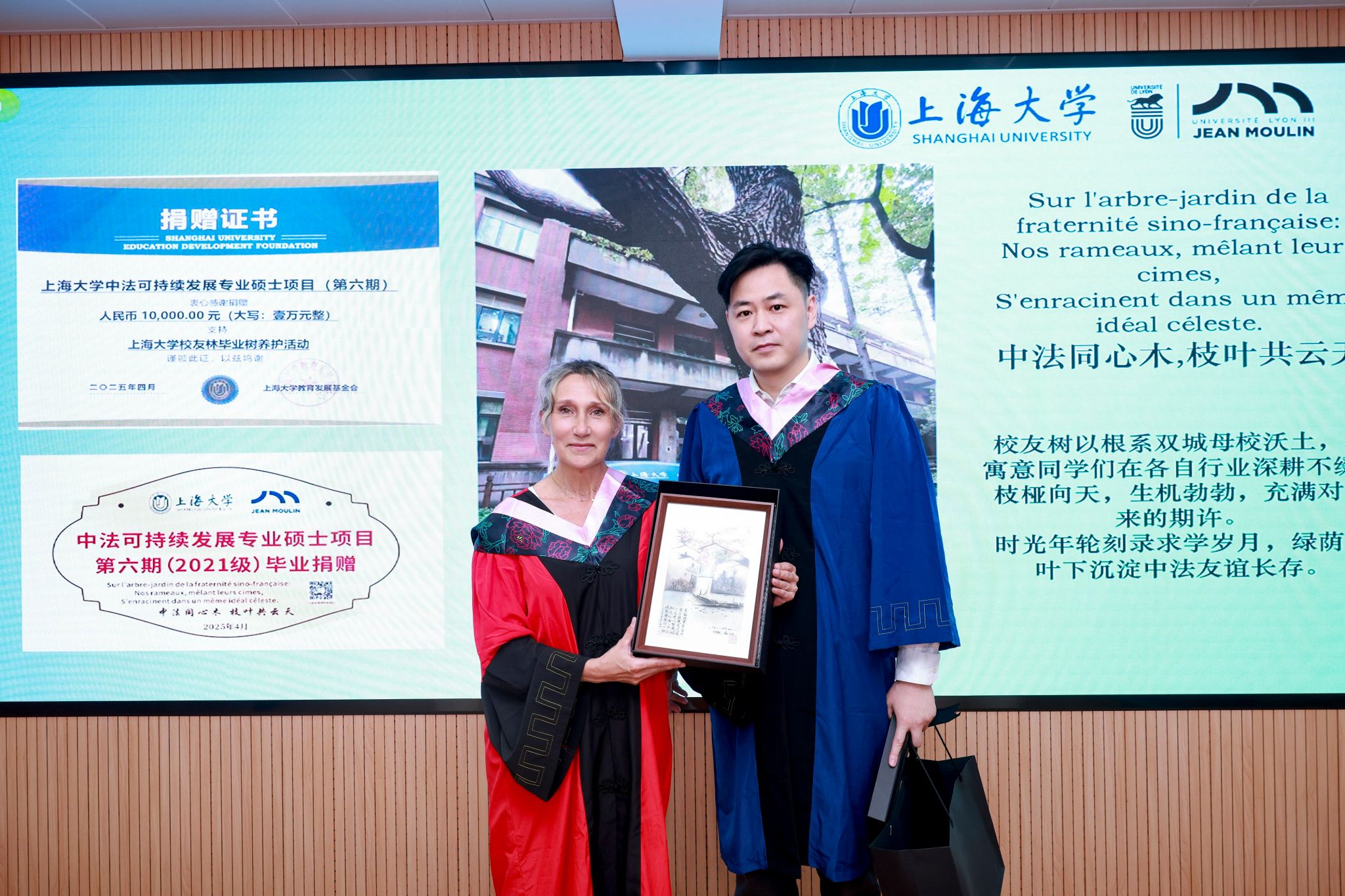 随后,上海经济管理中心主任朱明原为毕业生送上诚挚的祝福。他引用中法两国的哲学家、思想家对社会可持续发展的思考论点,从中西不同文化视角展现了对美好社会发展追求的共同目标。他引用梁漱溟之父梁济“这个世界会好吗?”的百年之问,希望同学们以“天下兴亡、匹夫有责”的担当,在新的起点上,把握时代机遇,知行合一,笃行致远,为这个世界变得更好做出自己的贡献。