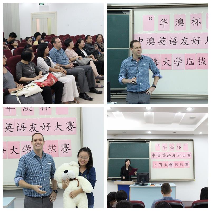 决赛分为定题演讲和即兴演讲两个环节,由悉尼工商学院和外语学院中外教师组成的评委团分别从演讲内容、语言水平和演讲技巧等方面对选手进行综合打分。选手们依次上台,以“Australia with My Eyes”为主题进行3分钟的英语演讲。饱含激情地向大家介绍了他们眼中的澳大利亚,用自己独特的视角去发现澳大利亚的美。每位选手都表现出了高超的英语技能、自信的精神面貌和对澳大利亚的了解,体现了上大学子的风采。随后选手们进行抽签,每个人抽到一个话题,经过10分钟准备后,对话题展开评论。这不仅考验选手的英语水平,还对他们现场的逻辑思维能力有一定的要求。