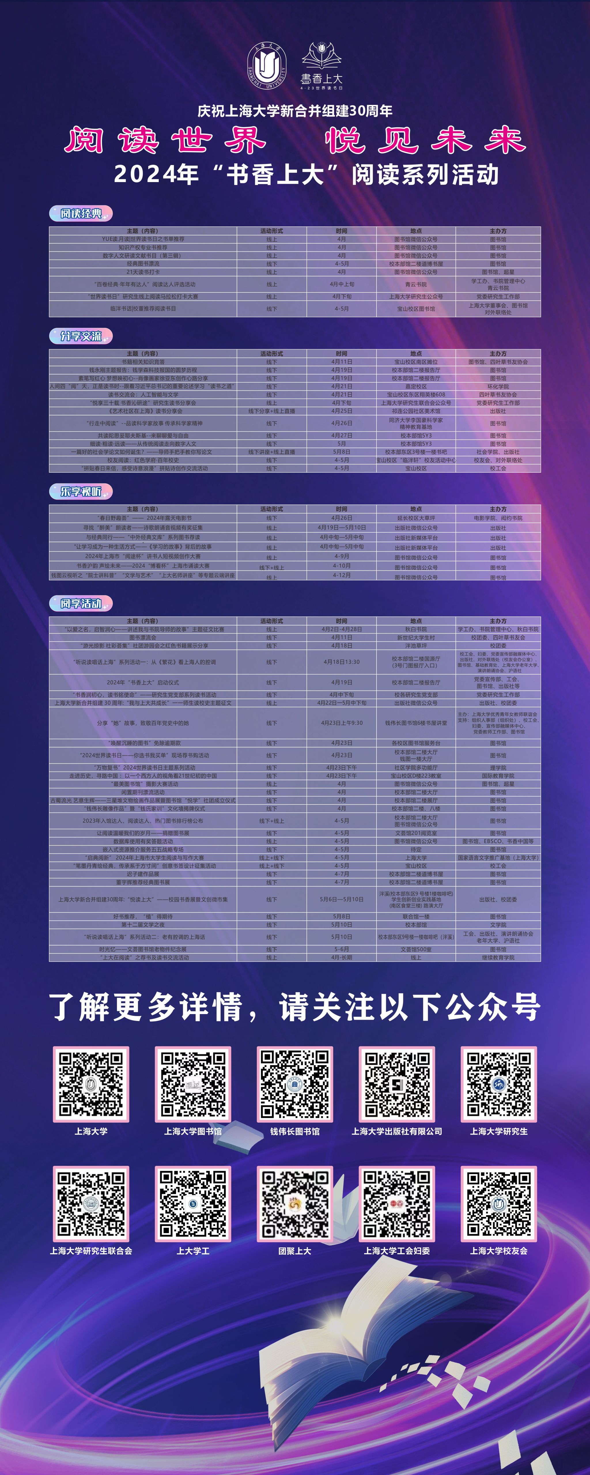 2024年“书香上大”全校阅读系列活动正式启动。今年的“书香上大”包括阅读经典、分享交流、乐享视听和阅享活动4大板块的近60项活动,内容丰富、精彩纷呈,欢迎上大师生积极关注并参与。